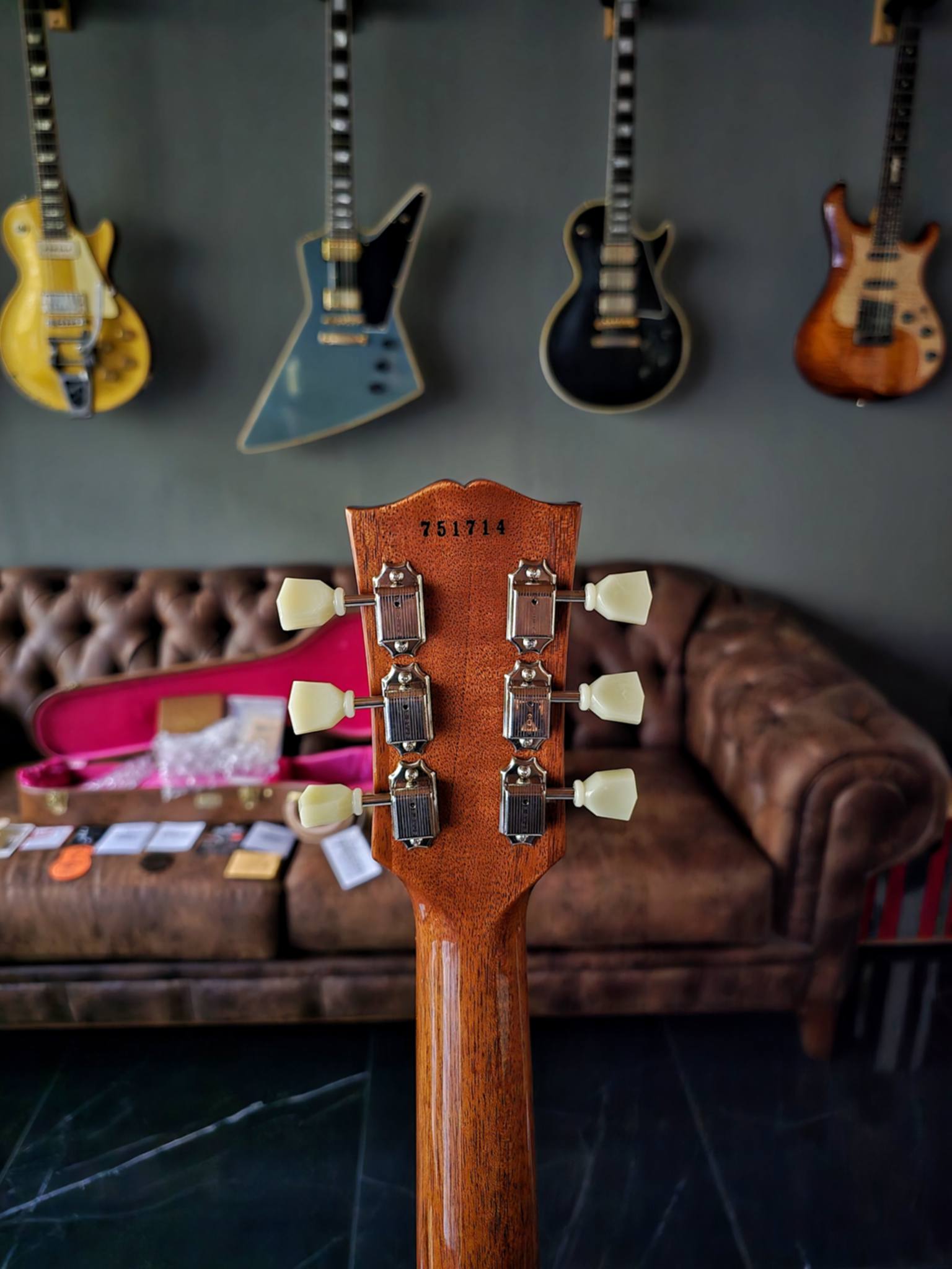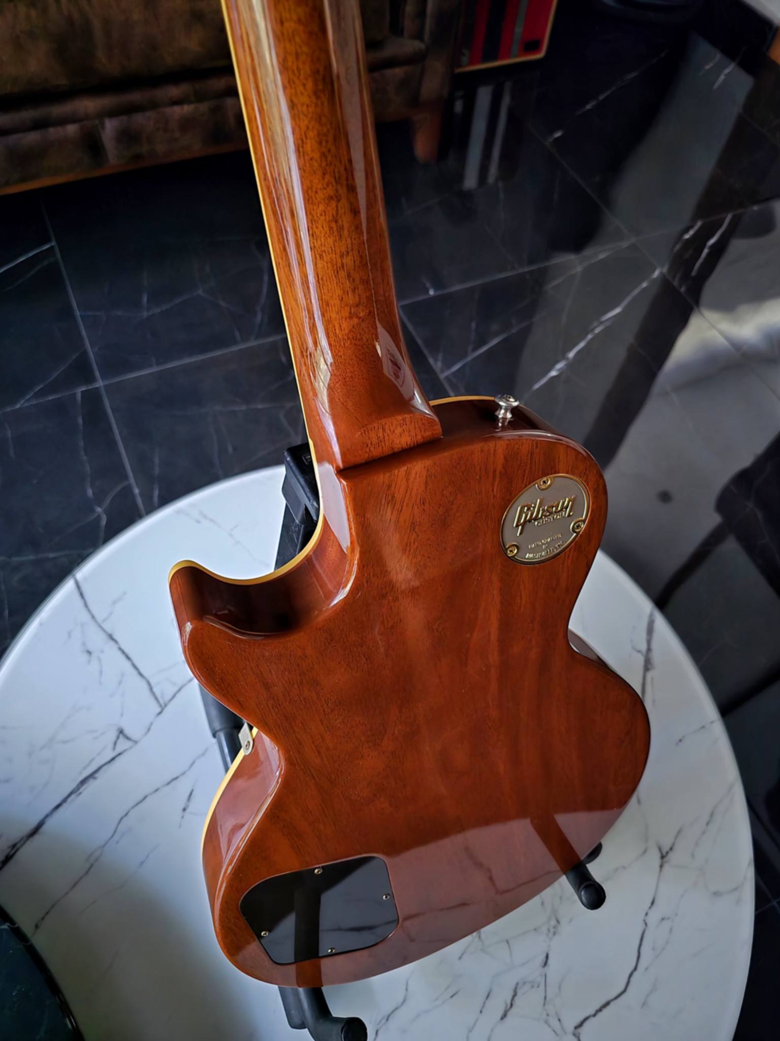 Body Shape: Les Paul Top: 2-Piece Figured Maple, Hide Glue Fit Back: 1-Piece Lightweight Mahogany Binding: 1-Ply Royalite Finish: Nitrocellulose Lacquer VOS Neck Material: Solid Mahogany Profile: Chunky C-Shape Scale Length: 24.75″ / 628.65mm Fingerboard Material: Indian Rosewood, Hide Glue Fit Fingerboard Radius: 12″ Number Of Frets: 22 Frets: Historic Medium-Jumbo Nut Material: Nylon Nut Width: 1.69″ / 42.85mm End of Board Width: 2.24″ / 56.89mm Inlays: Aged Cellulose Nitrate TrapezoidJoint: Long Tenon, Hide Glue Fit Headstock inlay: Gibson logo in Mother of Pearl, Les Paul Model silkscreen Hardware Finish: Nickel Tuner Plating: Nickel Bridge: No wire ABR-1 Saddle Material: Nickel-plated Brass Tailpiece: Lightweight Aluminum Stop Bar Tuning Machines: Kluson Single Line, Single Ring Pickguard: Laminated Cellulose Acetate Butyrate TrussRod: Authentic 1950s No-Tube Truss Rod Cover: Authentic Stepped 2-Ply Control Knobs: Gold Butyrate Top Hats Switch Tip: Amber Catalin Switchwasher: Silkscreened Cellulose Acetate Butyrate Jack Plate Cover: Laminated Cellulose Acetate Butyrate Control Covers: Black Royalite Strap Buttons: Aluminum Mounting Rings: M69 Cellulose Acetate Butyrate Pickup Covers: Authentic Profile Nickel Silver Neck Pickup: Custombucker Alnico 3 (Unpotted) Bridge Pickup: Custombucker Alnico 3 (Unpotted) Controls: 2 Volume, 2 Tone, CTS 500K Audio Taper Potentiometers, Paper-in-Oil Capacitors Pickup Selector: 3-Way Switchcraft Output Jack: 1/4″ Switchcraft