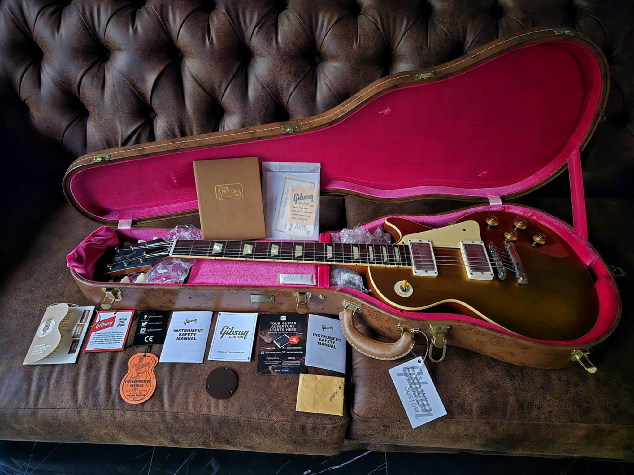 The iconic ’57 Goldtop has been the tool of choice for countless guitar heroes. Its elegant gold finish, classic solid mahogany/maple construction and versatile humbucking pickups represent everything one could possibly need in a Les Paul model. This authentic recreation exemplifies Gibson Custom Shop’s tireless quest for accuracy to the original year of production, from the woods to the construction to the parts and precise contours throughout. Each Custom Shop Reissue is every bit the instrument and statement piece as the priceless vintage examples, providing an ownership experience that is endlessly fun.